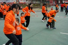 爸爸媽媽抱著小朋友輕松地越過障礙,朝著終點(diǎn)的椅子一路狂奔!
