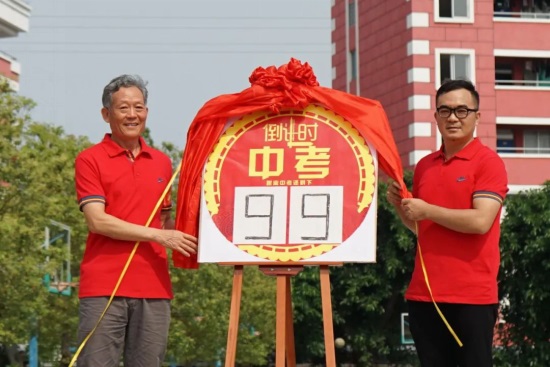 羅金宏校長和趙萬杰級長為中考倒計(jì)時(shí)牌揭幕,宣告九年級全體師生正式向最后的百日沖刺發(fā)起總攻。