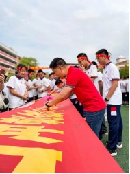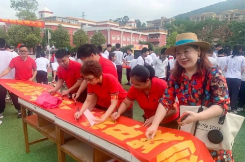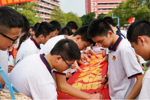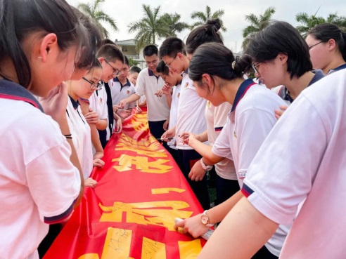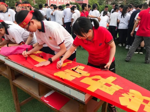 宣誓完畢,領(lǐng)導(dǎo)、老師、家長和學(xué)生在各班的標(biāo)語橫幅上鄭重簽下自己的名字并互相鼓勵。