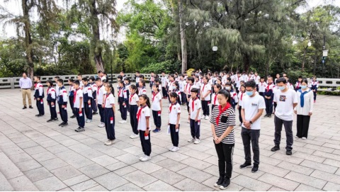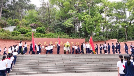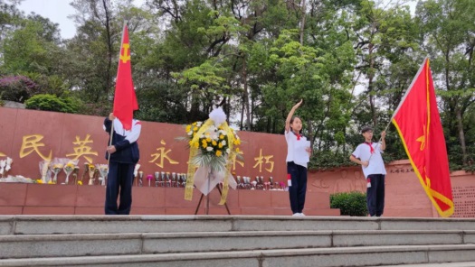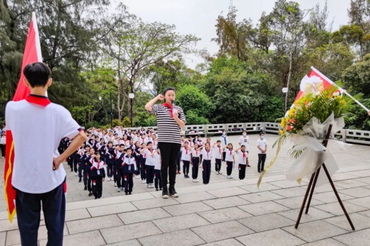 面向紀(jì)念碑,全體師生在黃翠玲大隊輔導(dǎo)員帶領(lǐng)下宣誓呼號并唱隊歌,把對人民英雄深深的哀思和崇高的敬意化作錚錚誓詞,響徹云霄。