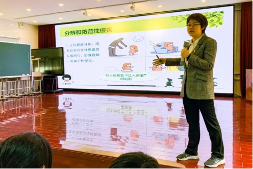 陸主任化身“知心姐姐”,從青春期的概念引入,圍繞“青春期生理心理特征”、“異性交往的基本原則”等議題,引發(fā)大家討論思索。再運(yùn)用圖片、視頻、案例對青春期生理、心理、衛(wèi)生保健知識展開講解,引導(dǎo)孩子們以科學(xué)認(rèn)真的態(tài)度對待青春期出現(xiàn)的憂慮、煩躁和對異性好奇等心理。