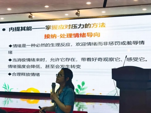 在同學(xué)們目前的壓力現(xiàn)狀有了初步了解后,林佩珠老師以生動的事例、科學(xué)的知識讓同學(xué)們明白“適當?shù)膲毫谷诉M步”。