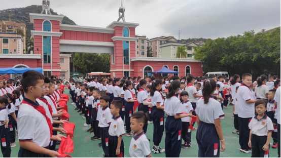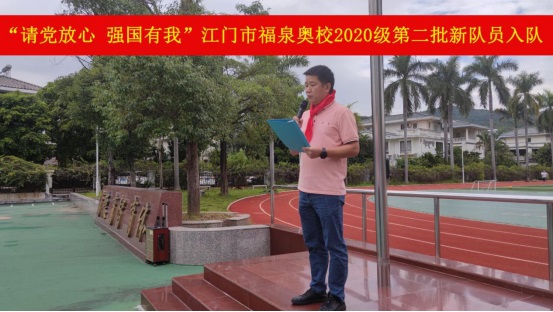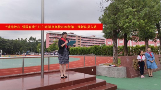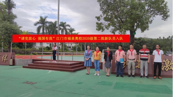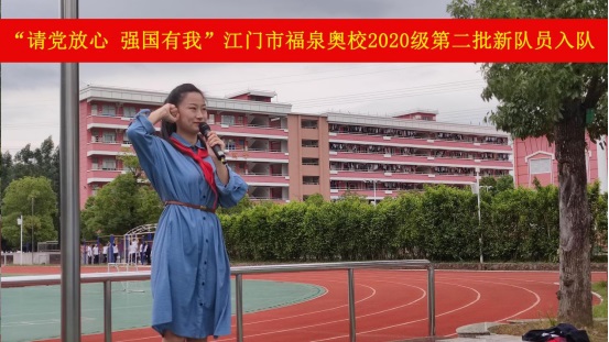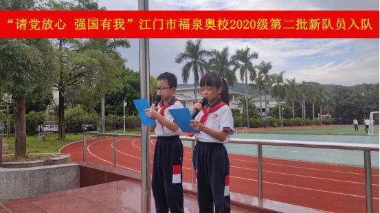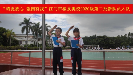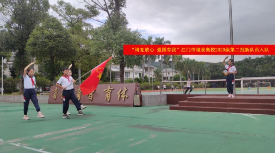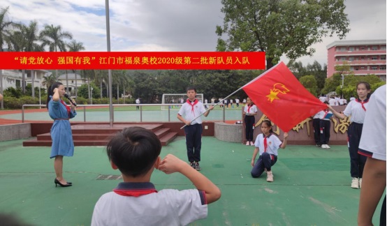 10月11日,“請黨放心,強國有我”江門市福泉奧林匹克學校小學部2020級第二批少先隊員入隊儀式在升旗廣場上隆重舉行。旗手們在雄壯的出旗曲中入場,拉開活動的序幕。