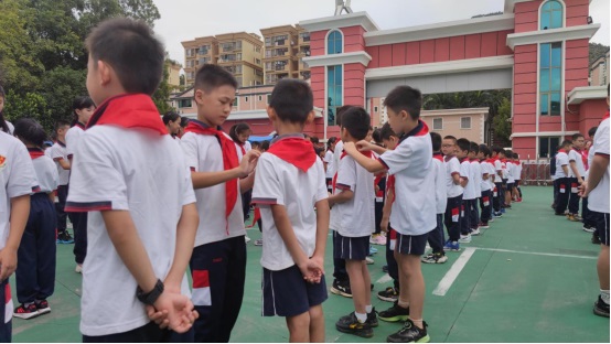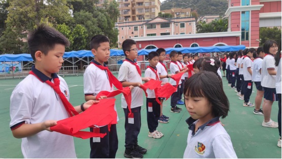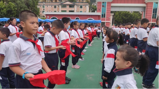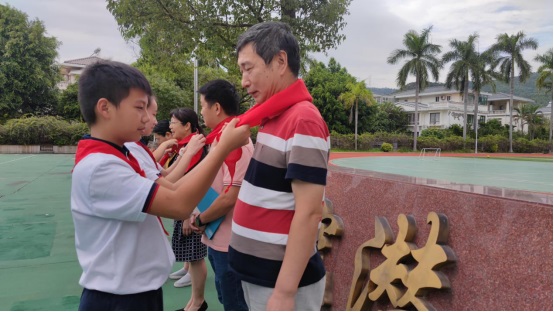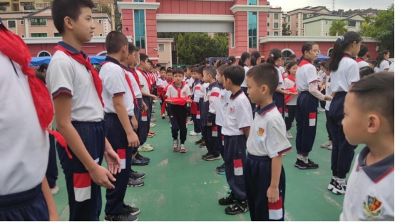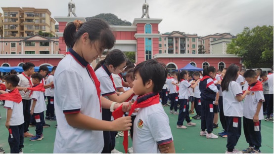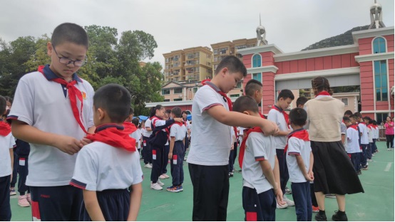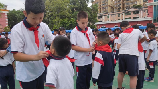 五年級老隊員為新隊員佩戴紅領巾。