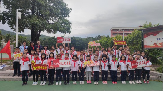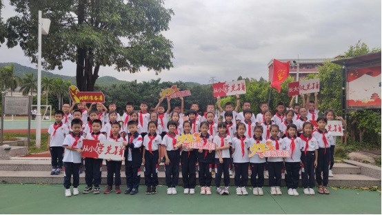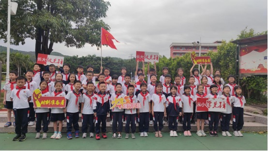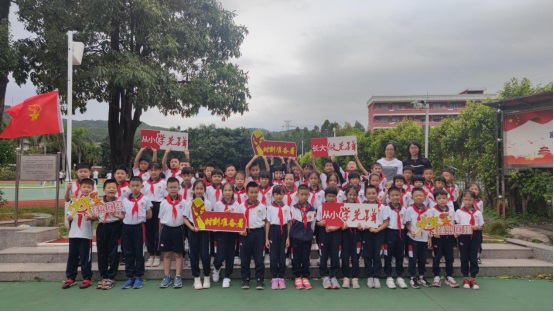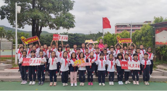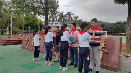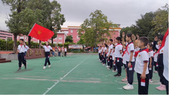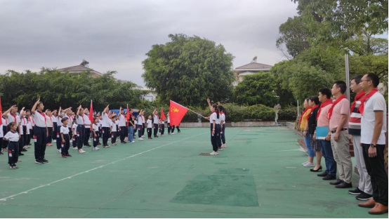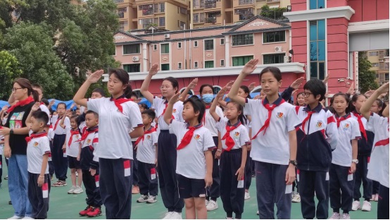 黃翠玲大隊輔導員帶領全體隊員莊嚴宣誓:我是中國少年先鋒隊隊員,我在隊旗下宣誓:我熱愛中國共產(chǎn)黨,熱愛祖國,熱愛人民,好好學習,好好鍛煉,準備著:為共產(chǎn)主義事業(yè)貢獻力量!
