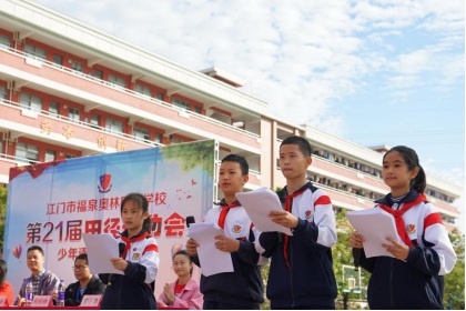 伴隨著槍聲,鐘校長宣布:“江門市福泉奧林匹克學(xué)校第21屆田徑運(yùn)動(dòng)會(huì)開幕!”,運(yùn)動(dòng)會(huì)各項(xiàng)比賽正式開始。此次開幕式不僅僅是展現(xiàn)了福泉學(xué)子團(tuán)結(jié)向上的風(fēng)采,更體現(xiàn)了當(dāng)代中小學(xué)生熱愛運(yùn)動(dòng)的精神風(fēng)貌。