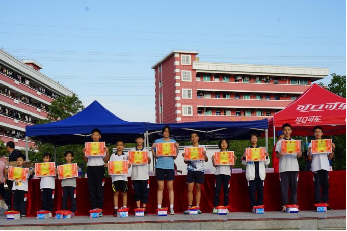 總裁判長黃海明老師宣布本屆優(yōu)秀運(yùn)動(dòng)員名單、各班團(tuán)體總分等獎(jiǎng)項(xiàng),并由學(xué)校領(lǐng)導(dǎo)為獲獎(jiǎng)班級(jí)和運(yùn)動(dòng)員進(jìn)行頒獎(jiǎng)。