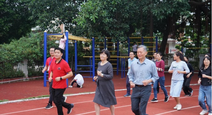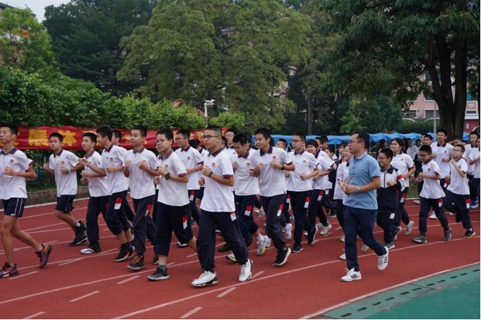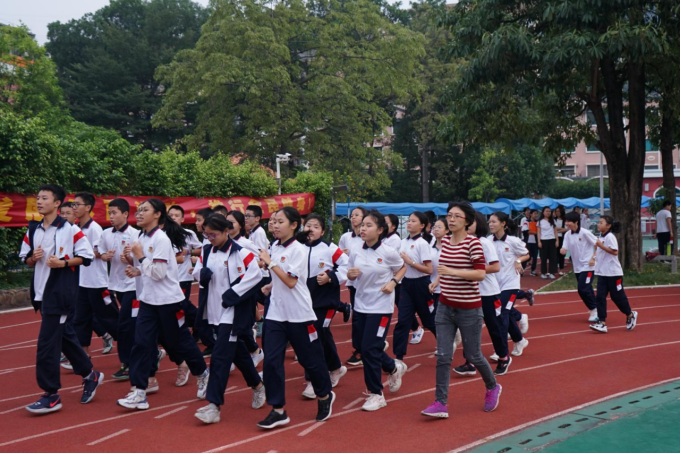 伴隨著激昂的樂(lè)曲,由鐘明洋校長(zhǎng)、羅金宏校監(jiān)、陳曉紅校長(zhǎng)助理、何梓林主任等領(lǐng)導(dǎo)打頭陣,率先領(lǐng)跑在隊(duì)伍前面,各班方陣緊隨其后,拉開(kāi)了秋冬季長(zhǎng)跑活動(dòng)的序幕。