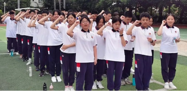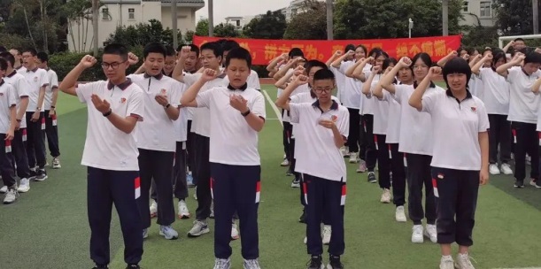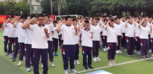 各班領(lǐng)誓員上臺(tái)帶領(lǐng)同學(xué)們宣誓,鏗鏘有力的吶喊一浪高過一浪,同學(xué)們的激情在此刻徹底被點(diǎn)燃。在這莊嚴(yán)的時(shí)刻,向中考宣誓,向老師宣誓,向家長(zhǎng)宣誓,更是在向未來的自己宣誓:百日誓師赴中考,六月亮劍耀蒼穹!