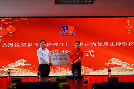 ▲校長(zhǎng)鐘明洋從江門(mén)一中黨委副書(shū)記雷志強(qiáng)手中接過(guò)“優(yōu)質(zhì)生源學(xué)?!迸曝?。