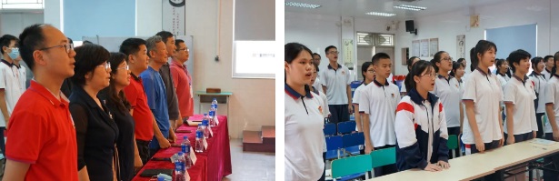 面對(duì)鮮紅的團(tuán)旗,全體新團(tuán)員在團(tuán)委書(shū)記葉頌堯老師的帶領(lǐng)下,舉起右拳以最宏亮的聲音進(jìn)行莊嚴(yán)宣誓。在高喊出自己名字的那一刻,新團(tuán)員們肩負(fù)起了作為一名共青團(tuán)員光榮而神圣的使命擔(dān)當(dāng)。