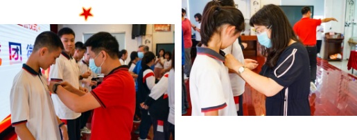 校長(zhǎng)鐘明洋、黨支部書(shū)記梁協(xié)和等校領(lǐng)導(dǎo)為新團(tuán)員佩戴團(tuán)徽。團(tuán)徽是共青團(tuán)的標(biāo)志,也象征著一份責(zé)任與要求:每位團(tuán)員在今后的學(xué)習(xí)和生活中團(tuán)結(jié)奮進(jìn),銳意進(jìn)取,發(fā)揮帶頭作用。