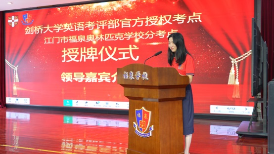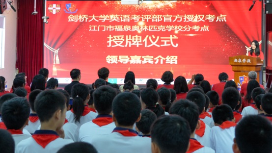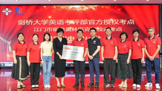 在熱烈的掌聲中,鐘明洋校長(zhǎng)和劍橋考點(diǎn)負(fù)責(zé)人黃佳女士在來(lái)賓、教師和學(xué)生的見(jiàn)證下,共同為“劍橋英語(yǔ)官方授權(quán)考點(diǎn)”揭牌!