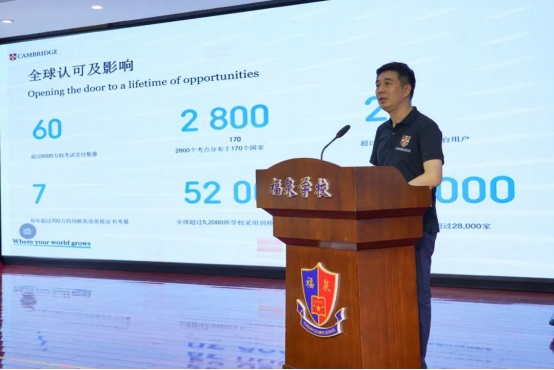 鄭德宇先生詳細(xì)介紹了劍橋考評(píng)的發(fā)展歷程、劍橋英語(yǔ)測(cè)評(píng)體系的科學(xué)性和劍橋英語(yǔ)資格證書(shū)的深遠(yuǎn)影響。他強(qiáng)調(diào),這一測(cè)評(píng)體系將充分發(fā)揮“以評(píng)促學(xué)、以考促學(xué)”的作用,從而有效提升福泉學(xué)子的英語(yǔ)實(shí)力。