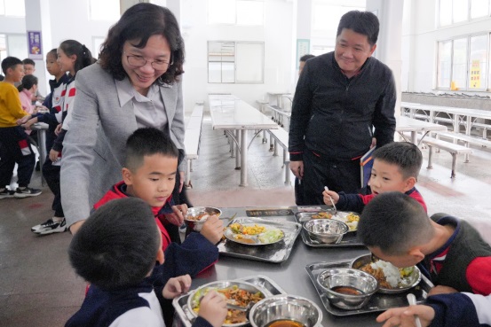 在食堂,周副市長實地調(diào)研學(xué)生就餐環(huán)境,詳細(xì)了解選餐流程,并與就餐學(xué)生親切交談。她強(qiáng)調(diào),食品安全是關(guān)系到廣大師生身體健康和生命安全的大事,要強(qiáng)化食品安全日常管理,嚴(yán)格把控食品安全關(guān)鍵環(huán)節(jié),切實筑牢食品安全防線,守護(hù)好校園“舌尖上的安全”,不斷提高師生、家長、社會對校園餐的安全感和滿意度。