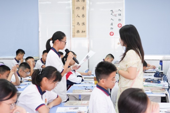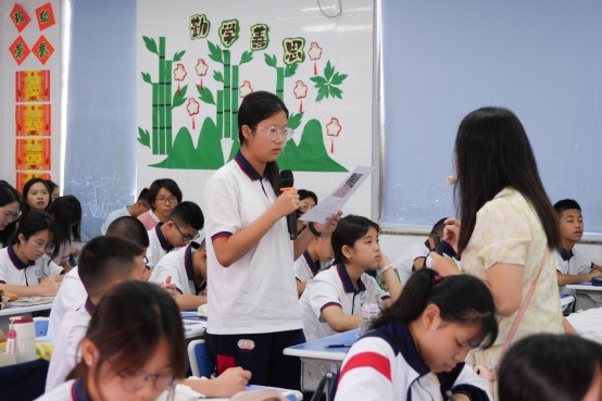 課堂上,田丹老師結(jié)合七4班學(xué)生的實際情況,以“班級紀(jì)念冊”為任務(wù)主線,通過情景化任務(wù)驅(qū)動,引導(dǎo)學(xué)生逐步深入。她將任務(wù)巧妙分解為“抓取細(xì)節(jié)對象—學(xué)習(xí)描寫方法—完成投稿修改”三個環(huán)節(jié),幫助學(xué)生逐步掌握“動作分解”“特寫放大”“情感疊加”等寫作技巧。田老師注重將寫作與真實需求緊密結(jié)合,既鞏固了技法,又賦予了寫作深刻的情感意義。課堂上,學(xué)生們在交流碰撞中不斷蛻變,展現(xiàn)出無限潛力。