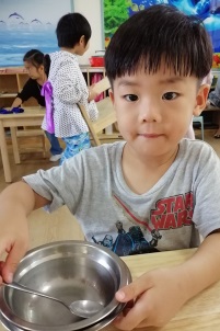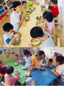 進(jìn)餐中,老師們關(guān)注孩子的飯量,及時(shí)為孩子添飯、添湯。餐后,孩子自己清理餐具和餐桌,培養(yǎng)孩子的自理能力;